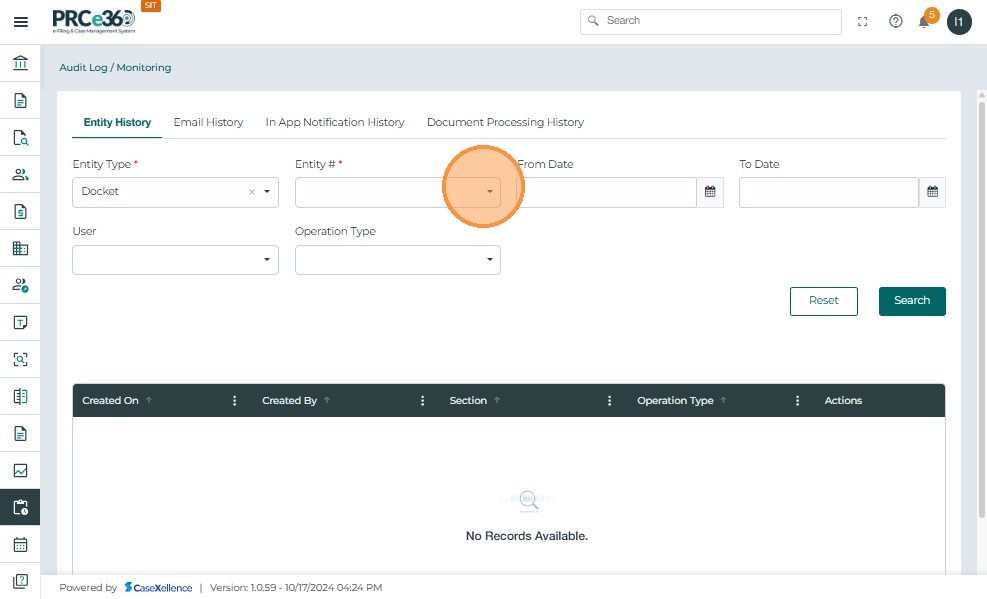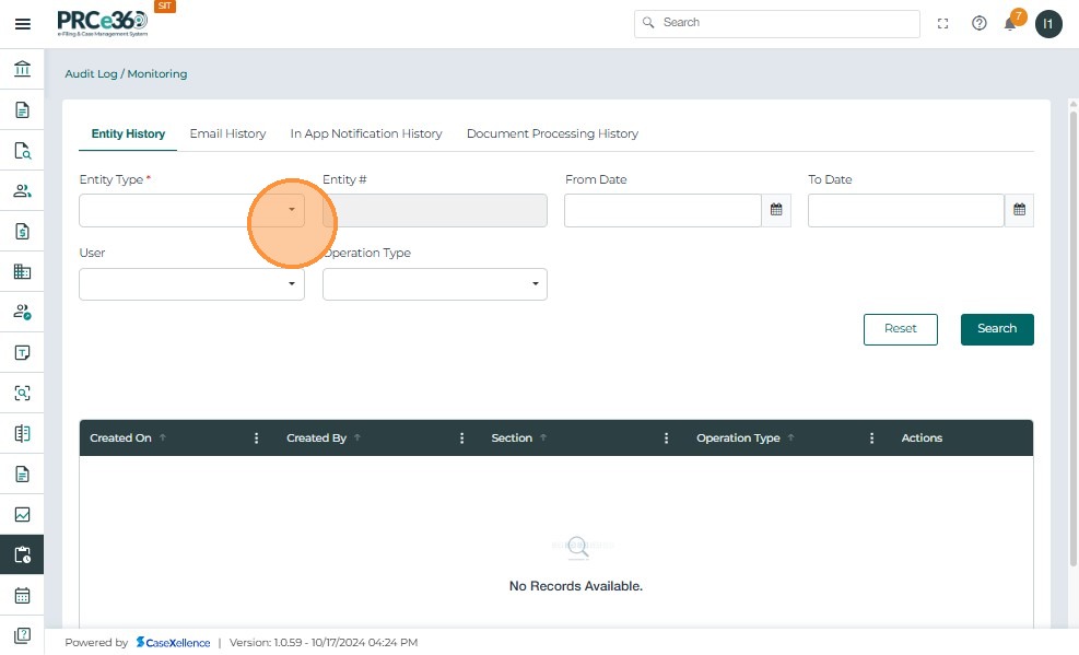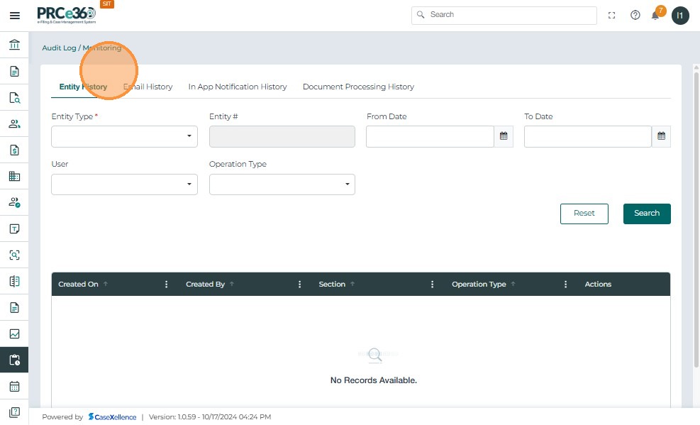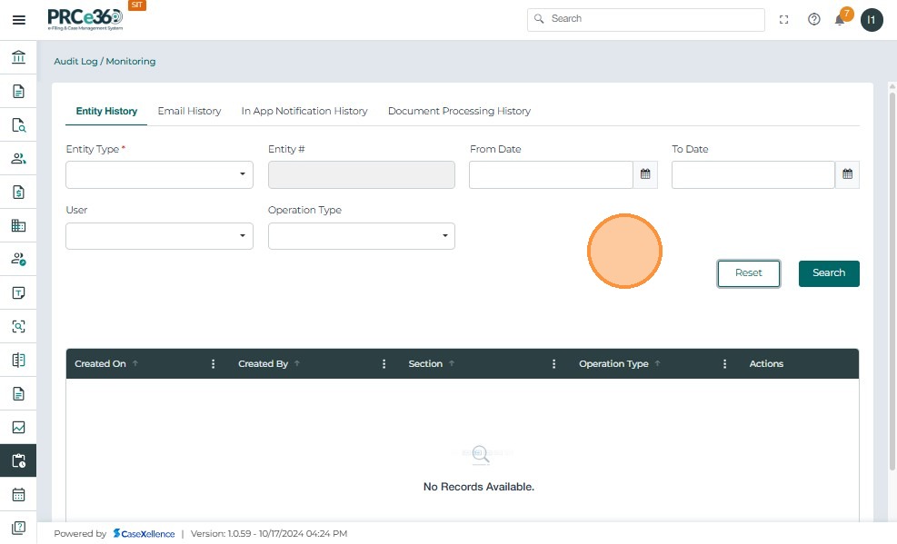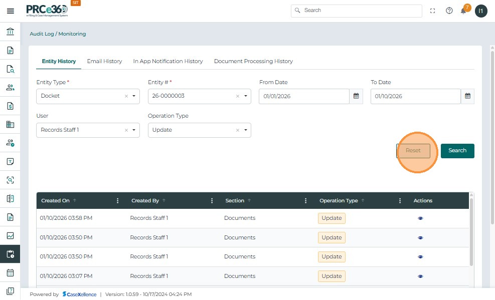 - The Reset action Clears all applied filters and resets the Entity History search criteria.