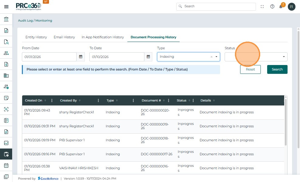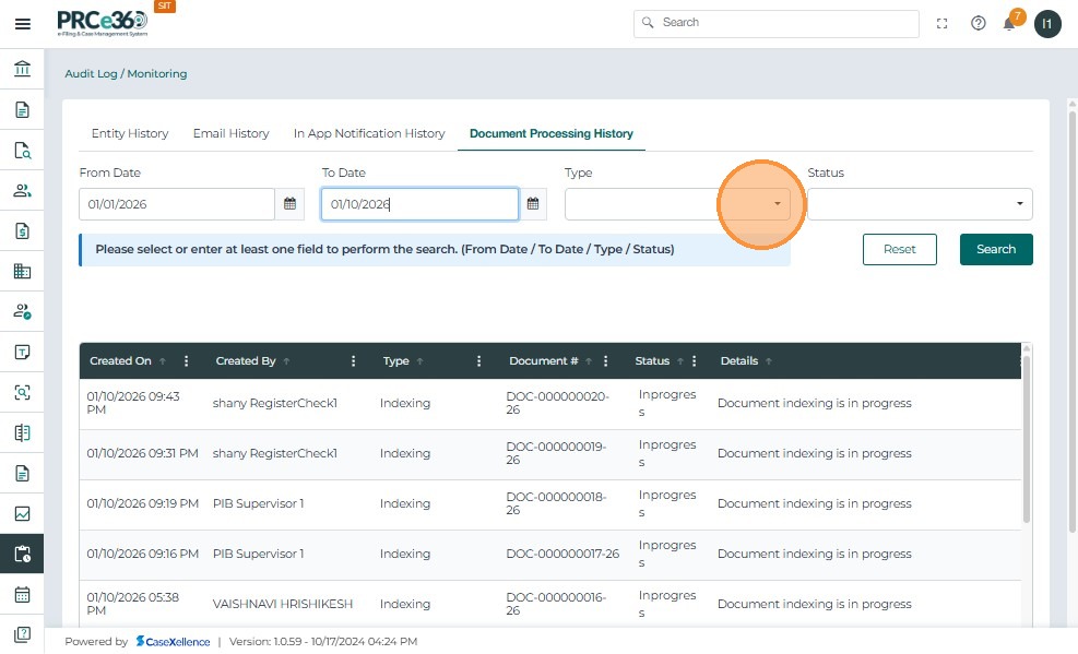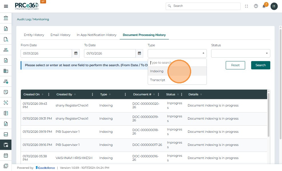 - Select Indexing from the Type dropdown to filter indexing-related records.