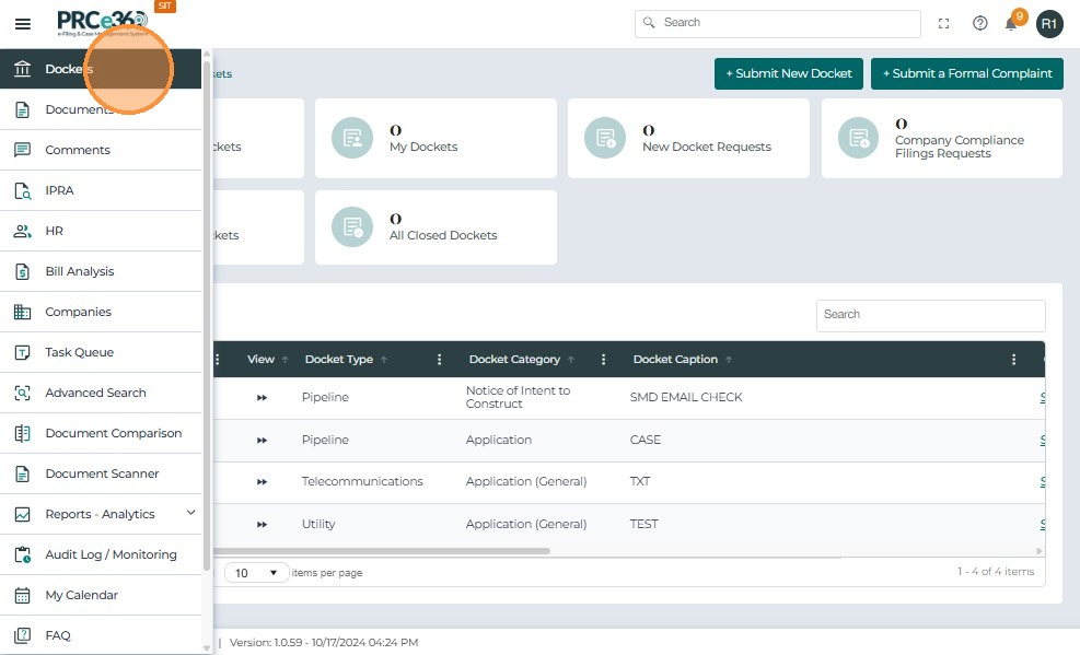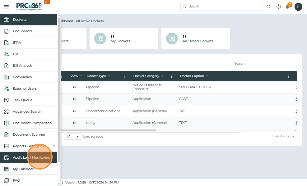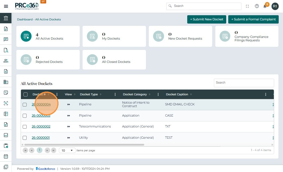 Click Dockets from the left menu to open the list of all active cases.