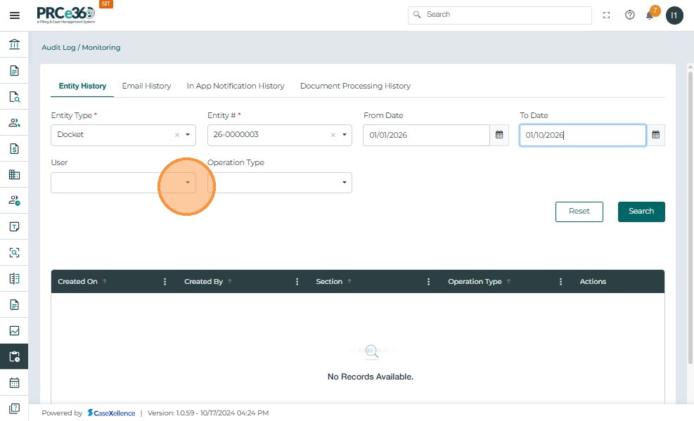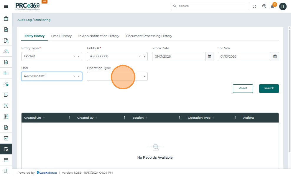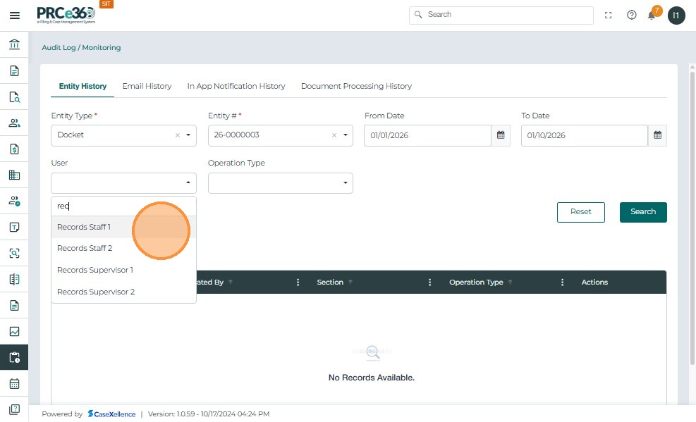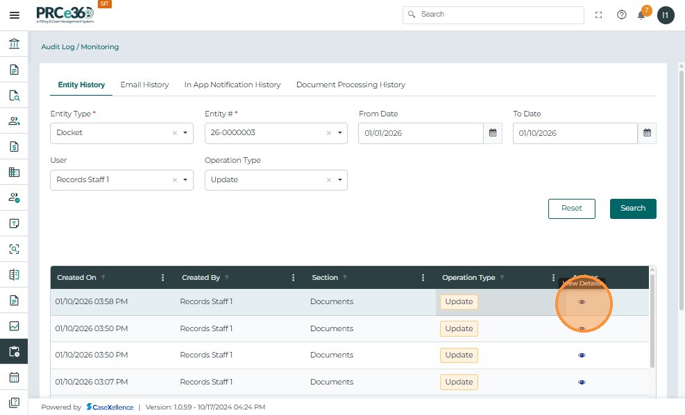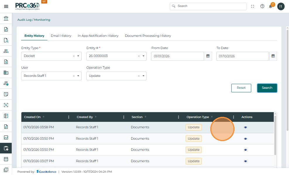 - Displays audit records for the selected Docket, date range, user, and operation type.
