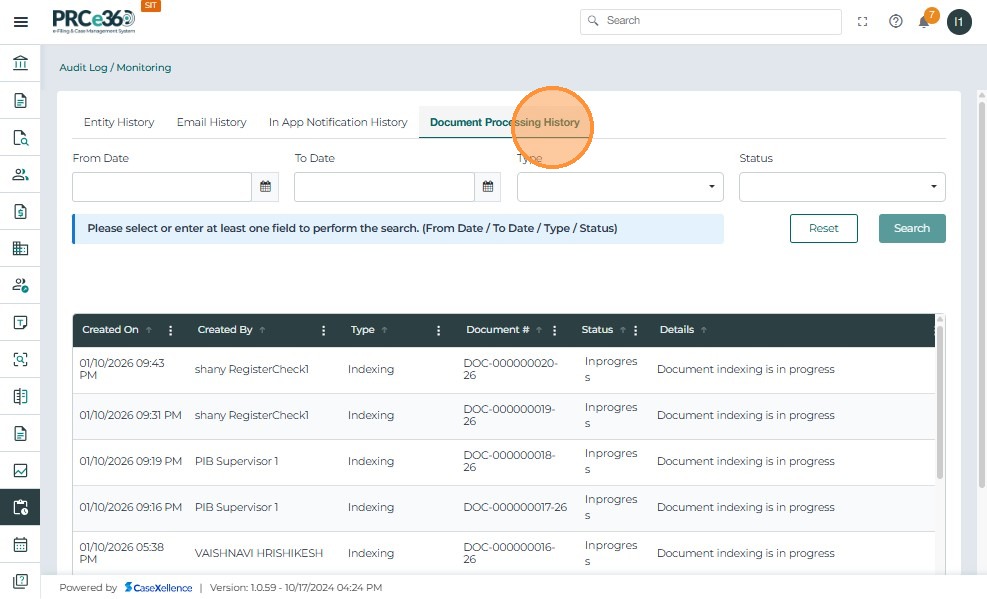 Document Processing History Tab