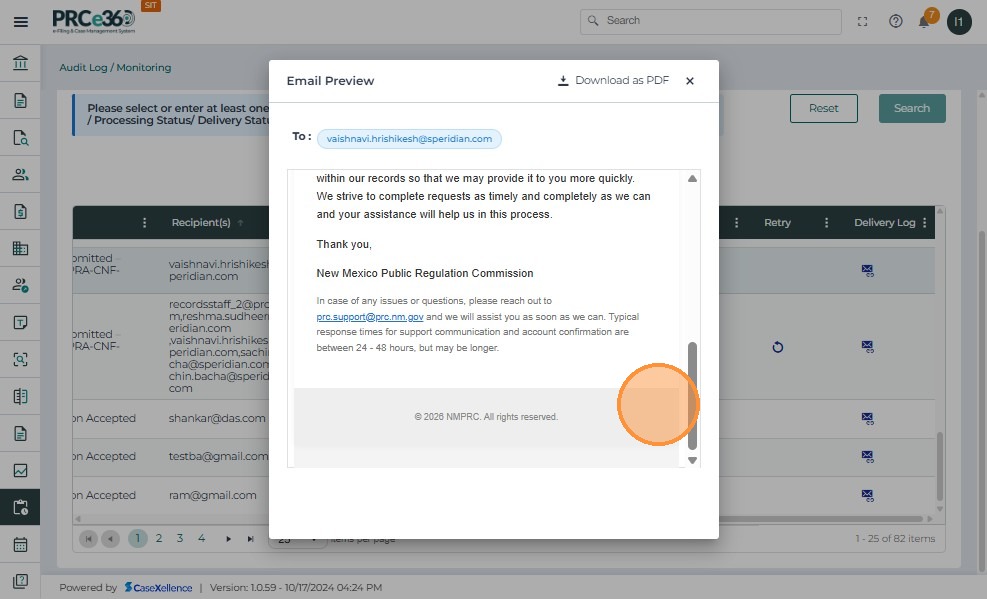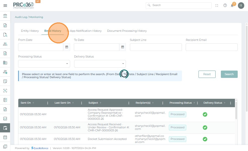- Email History: Displays all system-generated emails. Users can filter by date, subject, recipient, or status and view full email details through the preview option.