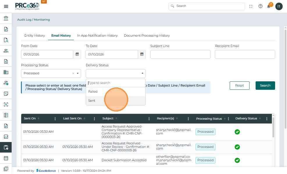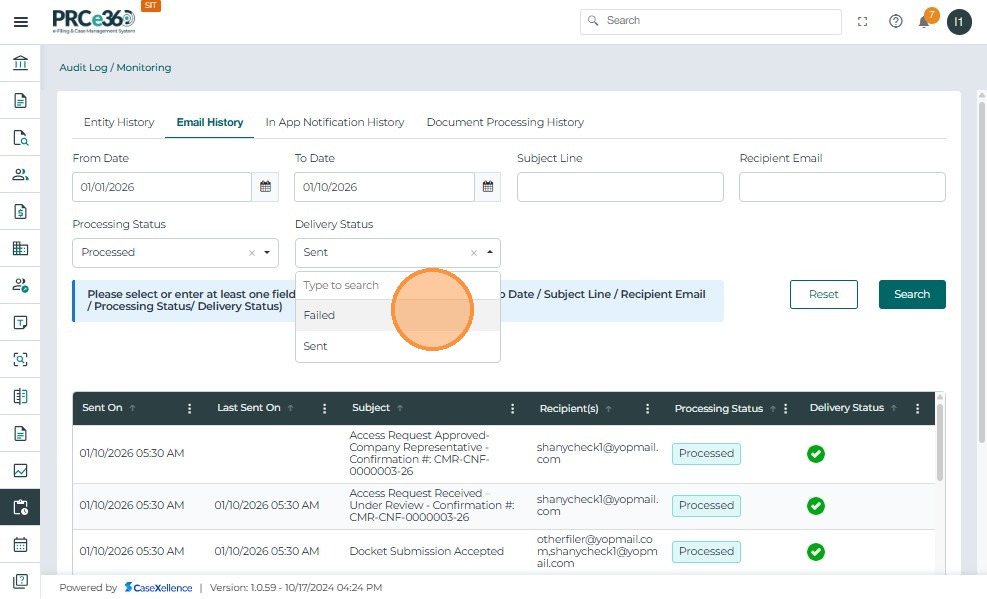 In the Email History tab, you can filter emails by Status to view messages based on their delivery state. Select Failed Status from the dropdown.