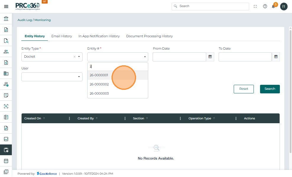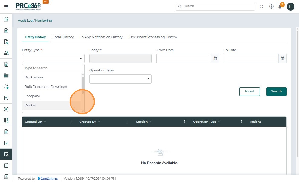 - Select “Docket” as the Entity Type.