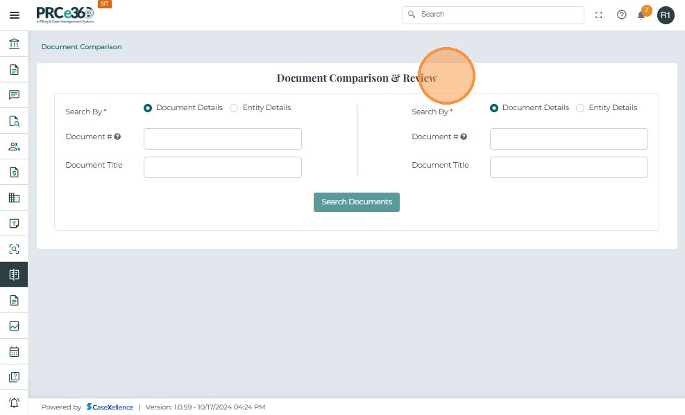 When the user clicks on the 'Document Comparison' section from the menu bar, the system displays the document comparison screen.
