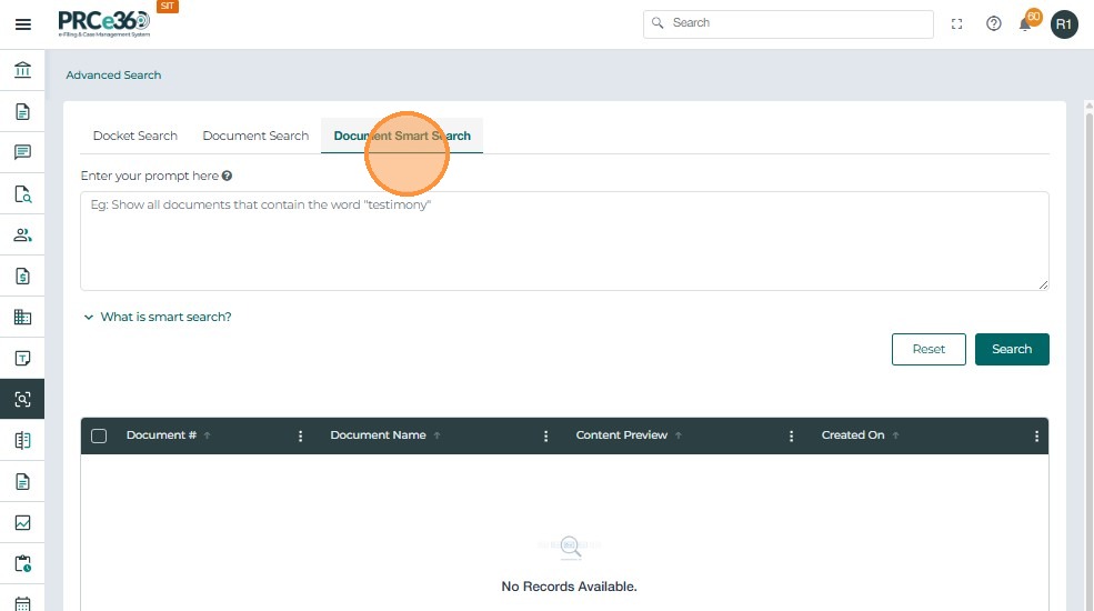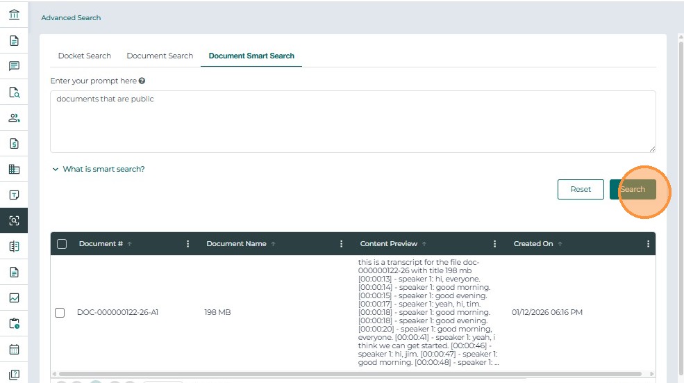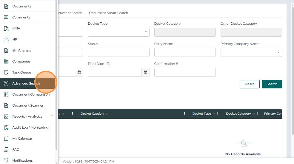 The Advanced Search feature enables users to find cases and documents using text-based and metadata filters.