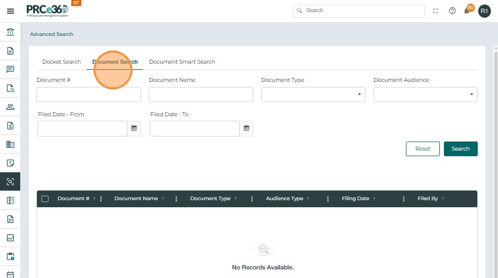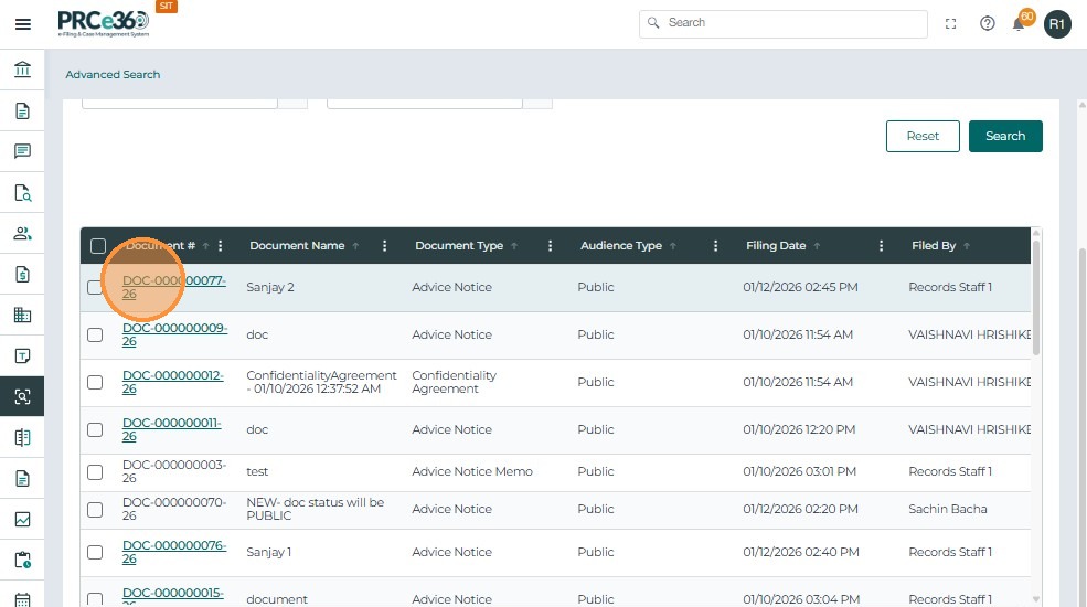 • Document #, Name, Type, Audience Type, Filed By, Filed Date